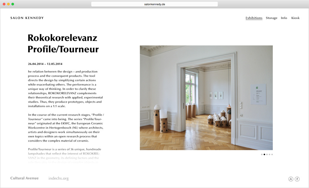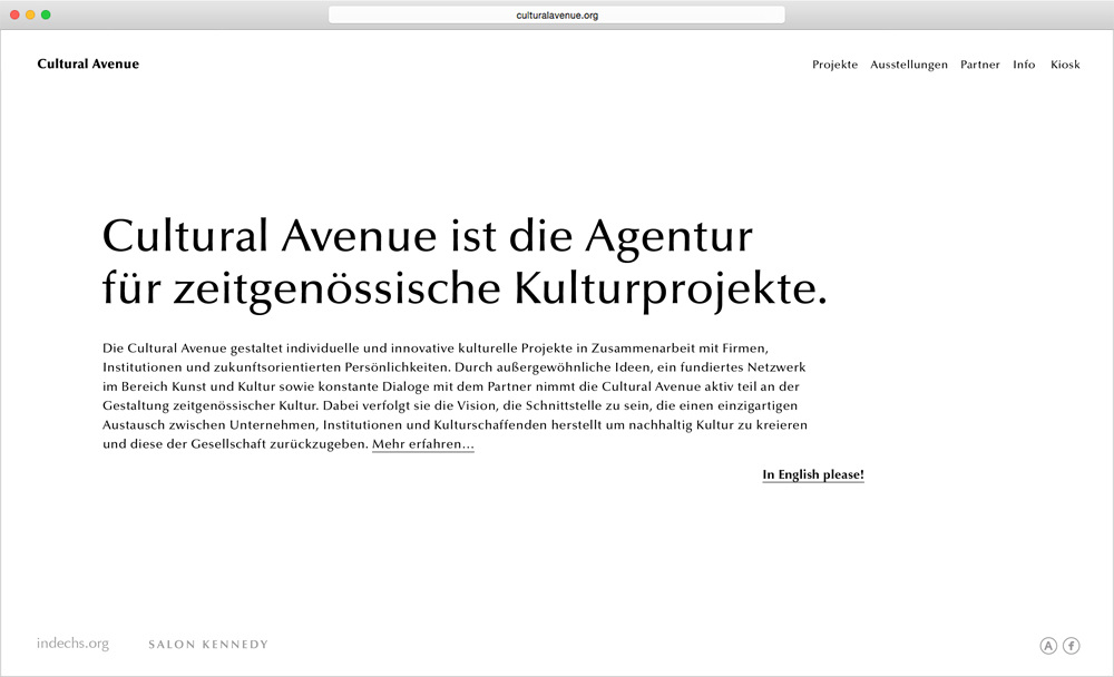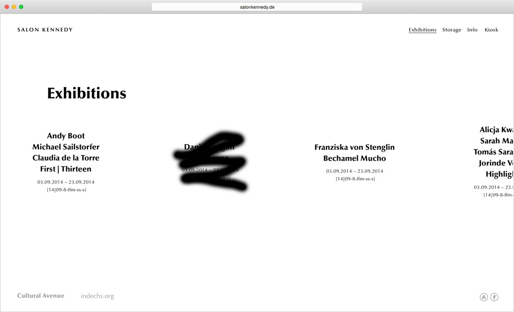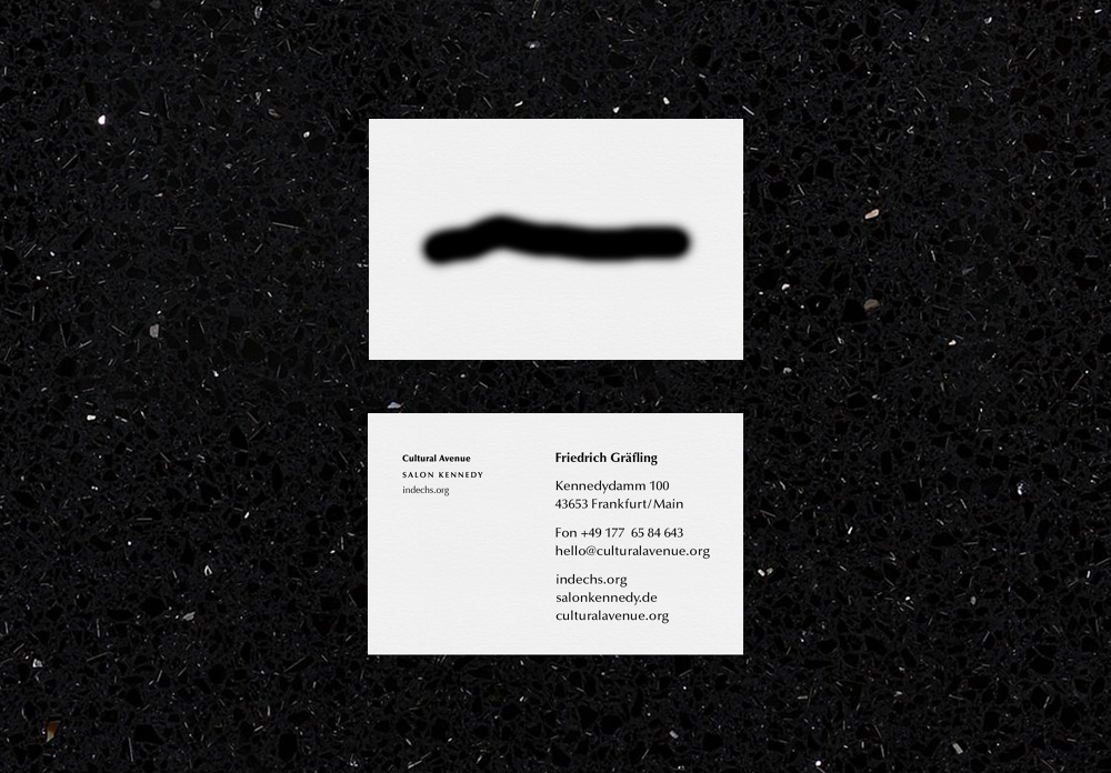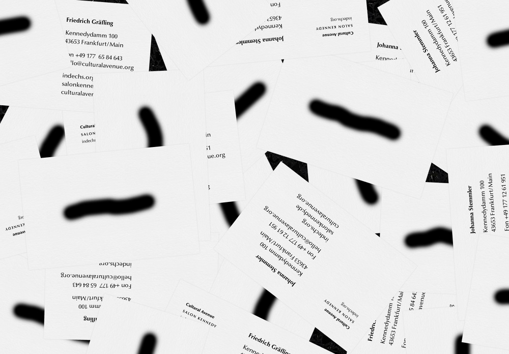Corporate design concept for the culture production Cultural Avenue, its gallery Salon Kennedy and blog indechs.org. The main element is an over-aestheticized version of a brushstroke, derivated from the tools typically used in image editing software such as Photoshop. In cooperation with Mario Hombeuel. Agency: C/O.